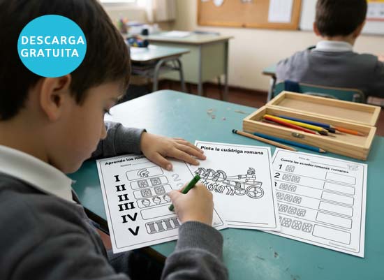 - Cuenta los escudos romanos: hasta 5 y escribe el número correcto, desarrollando habilidades de conteo.